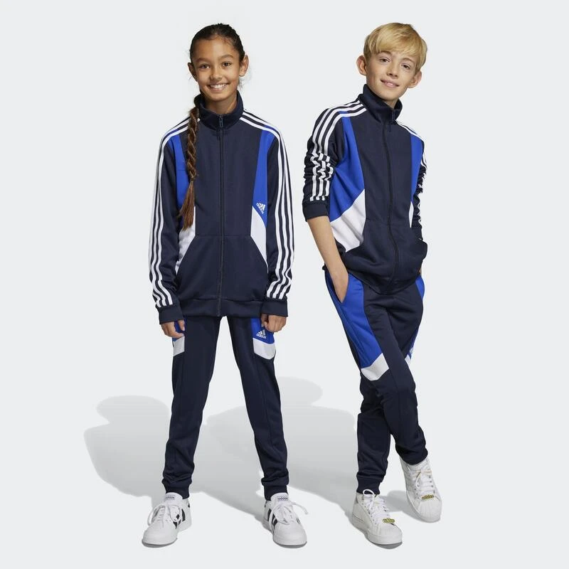 Dit junior adidas trainingspak is perfect voor alles wat de dag je brengt. Het is gemaakt van zachte dubbelgebreide stof om je comfortabel te houden op weg naar school, in huis, of onderweg naar vrienden. Door de geribbelde boorden blijft-ie goed zitten en de kleurvlakken geven ’t een opvallende look.Dit met 100% gerecyclede materialen gemaakte product vertegenwoordigt slechts één van onze oplossingen om plastic afval te verminderen.
