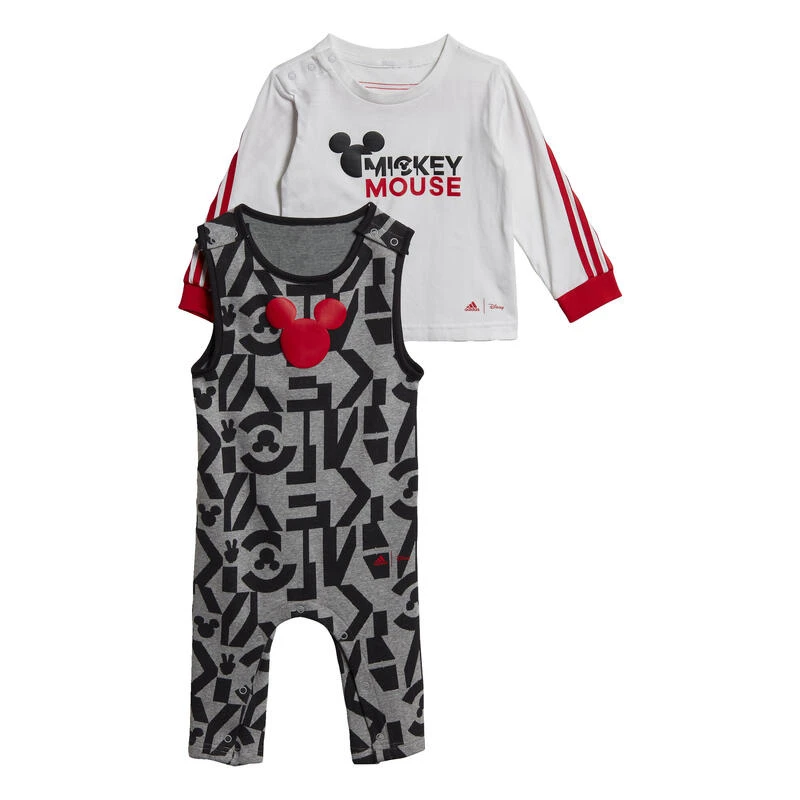 Een onesie en bijpassend sweatshirt met een Mickey Mouse-print en -graphics.