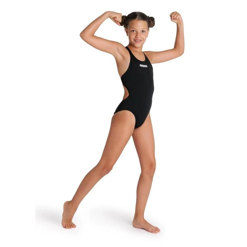 Arena Girl’s Team Solid Tech Swimsuit in Black is the ideal swimsuit for intense training days and regular pool use.