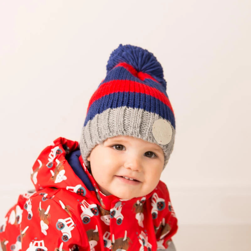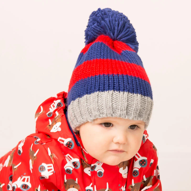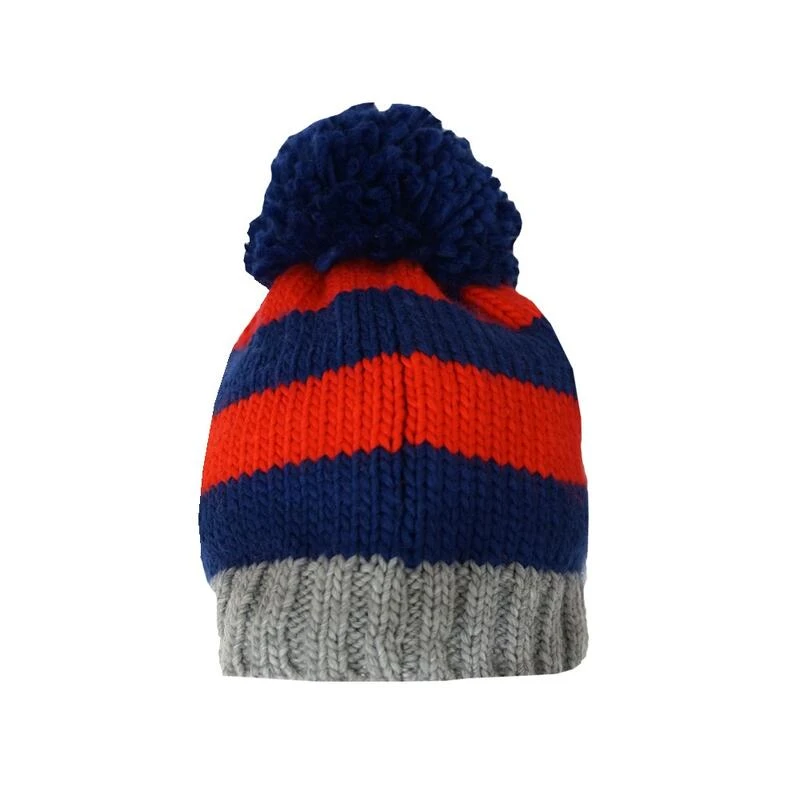 “Grof gebreid in rood, blauw en grijs, met een fleece voering en afgewerkt met een grote pompon.