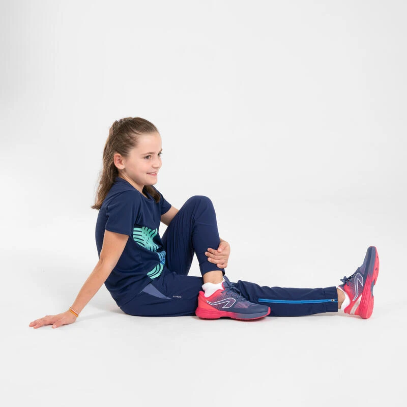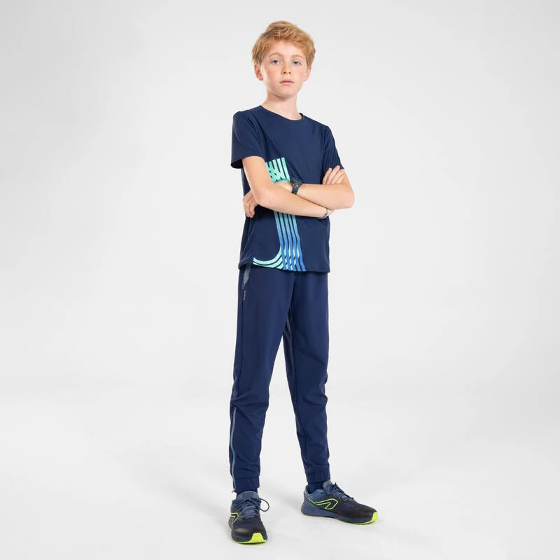 8612100Ons team met een passie voor atletiek ontwikkelde deze lichte en ademende sportbroek voor kinderen, ze is ideaal voor trainingen en wedstrijden in het tussenseizoen.Op zoek naar een sportbroek voor je kind? Deze hardloopbroek wordt beslist zijn favoriet voor trainingen en wedstrijden, dankzij de lichte en ademende stof, de 2 zakken met rits en de lange ritsen onder aan de pijpen