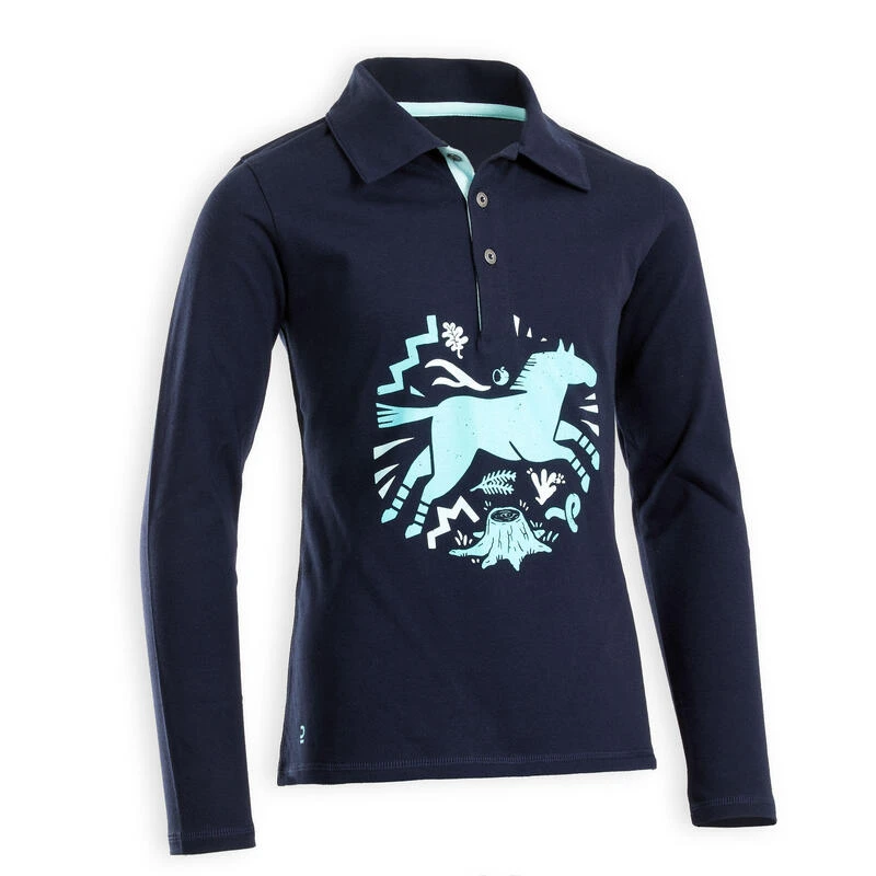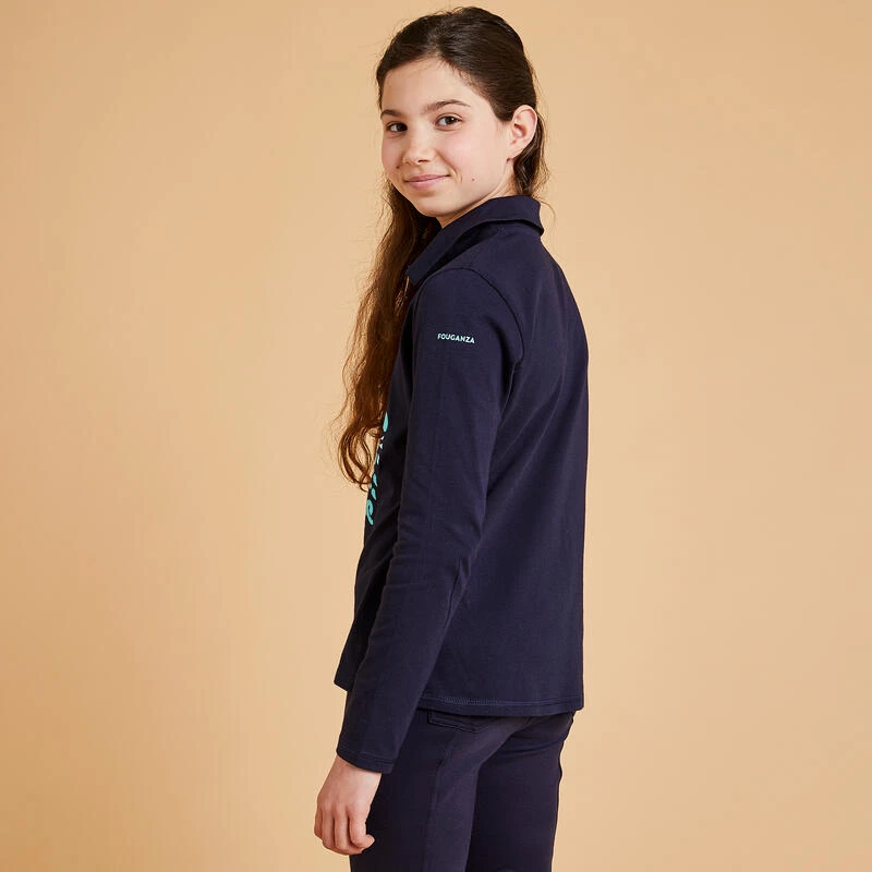 8580074Onze ontwikkelaars, die zelf paardrijden, ontwierpen dit poloshirt voor jonge ruiters! Hij is ideaal bij fris weer in de overgangstijd tussen seizoenen.Op zoek naar een mooi poloshirt dat aangenaam is om te dragen? Ons poloshirt 100 voor paardrijden is comfortabel, stijlvol en zorgt ervoor dat je helemaal op je gemak bent op je pony of paard.