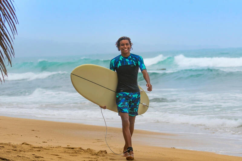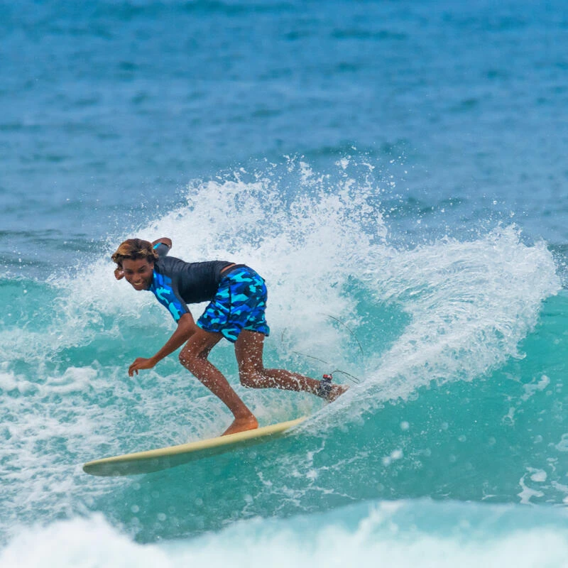 8677737Ontwikkeld door onze teams voor zonbescherming bij het surfen of bodyboarden. Water warmer dan 21°C.Uv-werende rashguard met korte mouwen voor kinderen. Beschermt tegen de zon, zelfs in het water, en beperkt irritatie door het schuren van het board. Aansluitend model in comfortabele stretchstof!