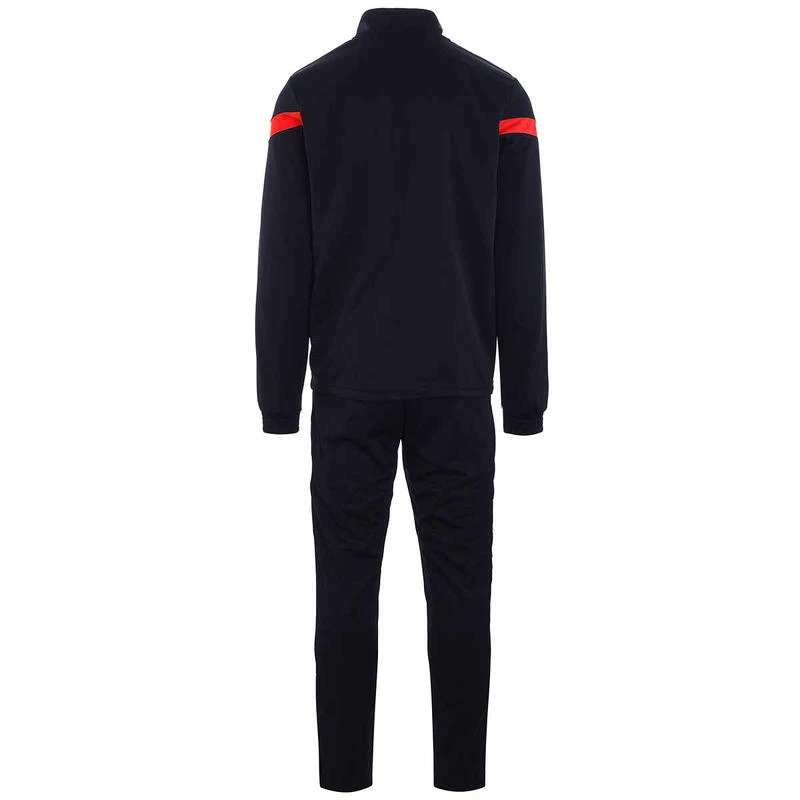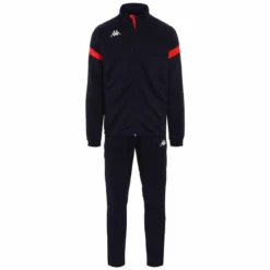100% polyester trainingspak, SLIM FITJasje met lange mouwen, opstaande kraag, ritssluiting, zijzakken zonder ritssluiting, gekleurde strepen op de mouwen, elastische tailleband met aantrekkoord aan de binnenkant, omini op de borst en op de voorkant van het trainingspak onderaan.